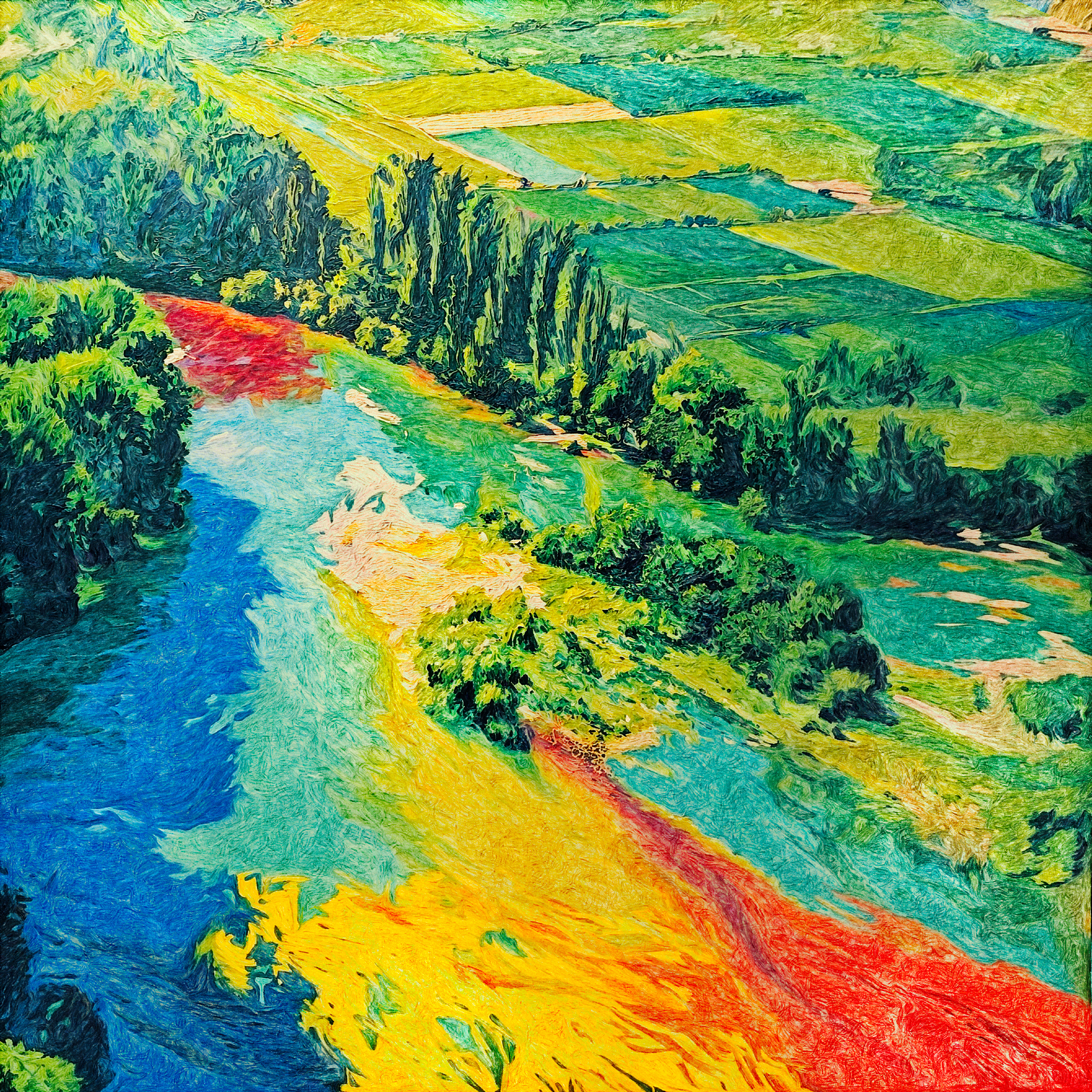 Numérique, utilisation d'IA avec intégration de feuilles de styles de peintures réelles de l'auteur et travail à la palette graphique. Tirage en digigraphie sur carton bois (Procédé EPSON d'impression avec encres pigmentaires durables)