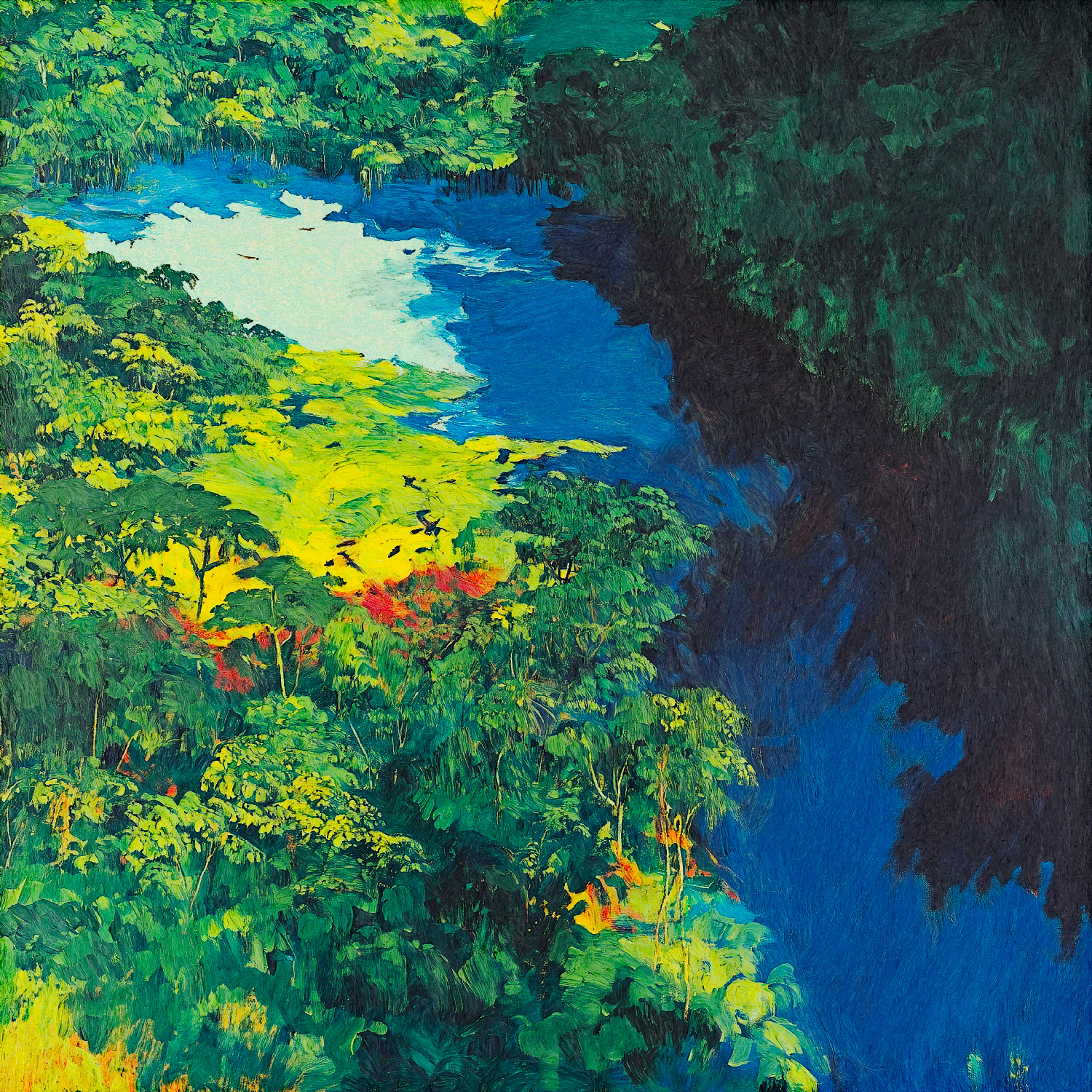 Numérique, utilisation d'IA avec intégration de feuilles de styles de peintures réelles de l'auteur et travail à la palette graphique. Tirage en digigraphie sur carton bois (Procédé EPSON d'impression avec encres pigmentaires durables)